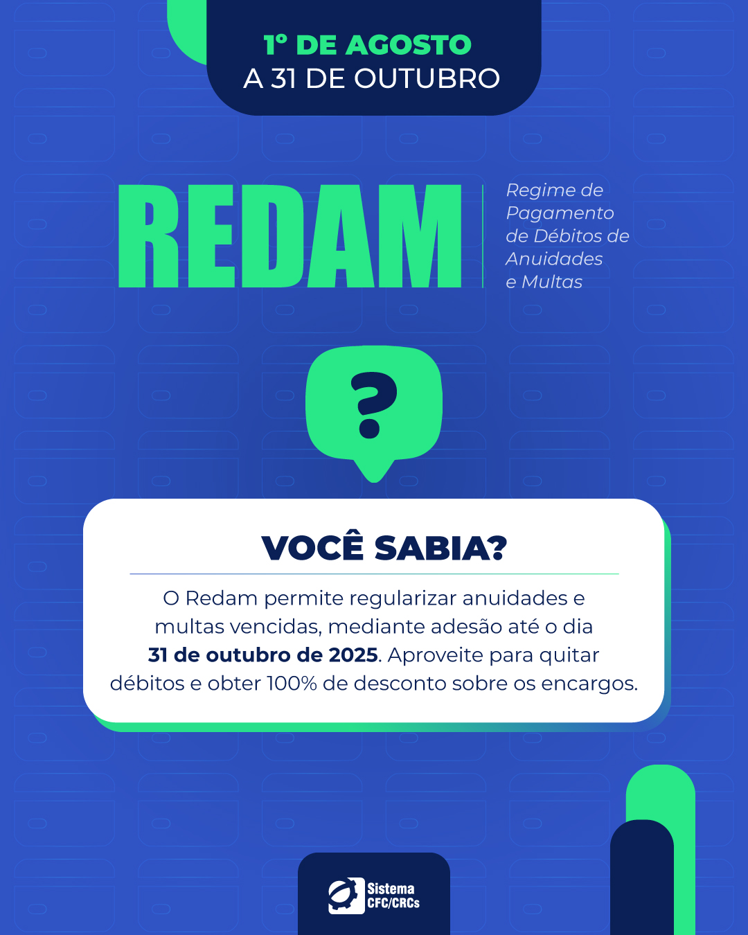 O Redam estará em vigor de 1º de agosto de 2025 a 31 de outubro de 2025, período durante o qual fica suspensa a vigência do inciso I do art. 13 da Resolução CFC nº 1.684, de 15 de dezembro de 2022, que trata de critérios para parcelamento de créditos de exercícios encerrados.