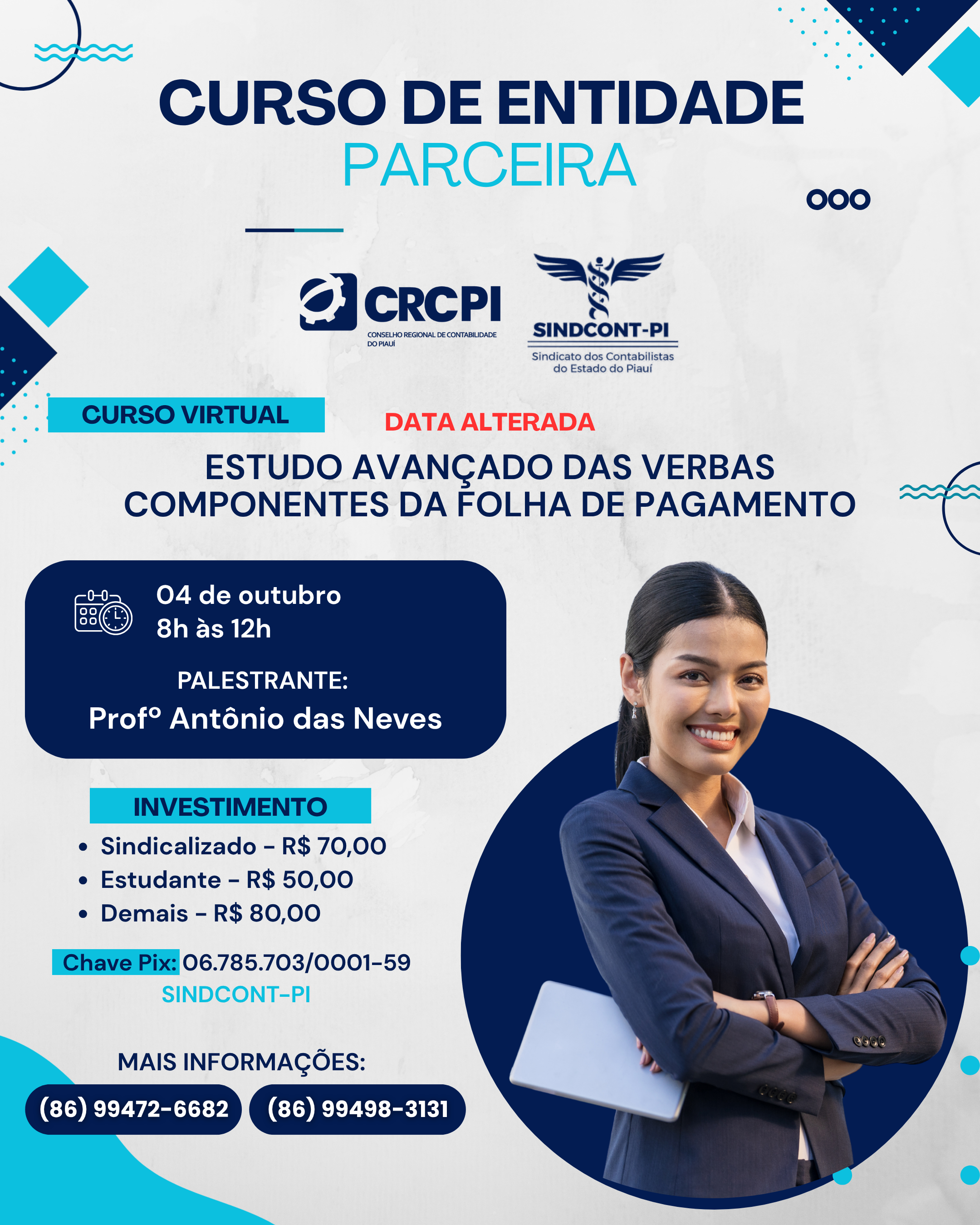 O curso virtual “Estudo Avançado das Verbas componentes da Folha de Pagamento”, com o Prof. Antônio das Neves, teve sua data alterada e acontecerá AMANHÃ, das 8h às 12h.