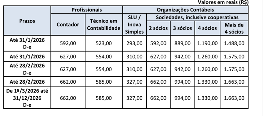 Os valores das anuidades devidas aos Conselhos Regionais de Contabilidade (CRCs), com vencimento em 31 de março de 2026, serão: