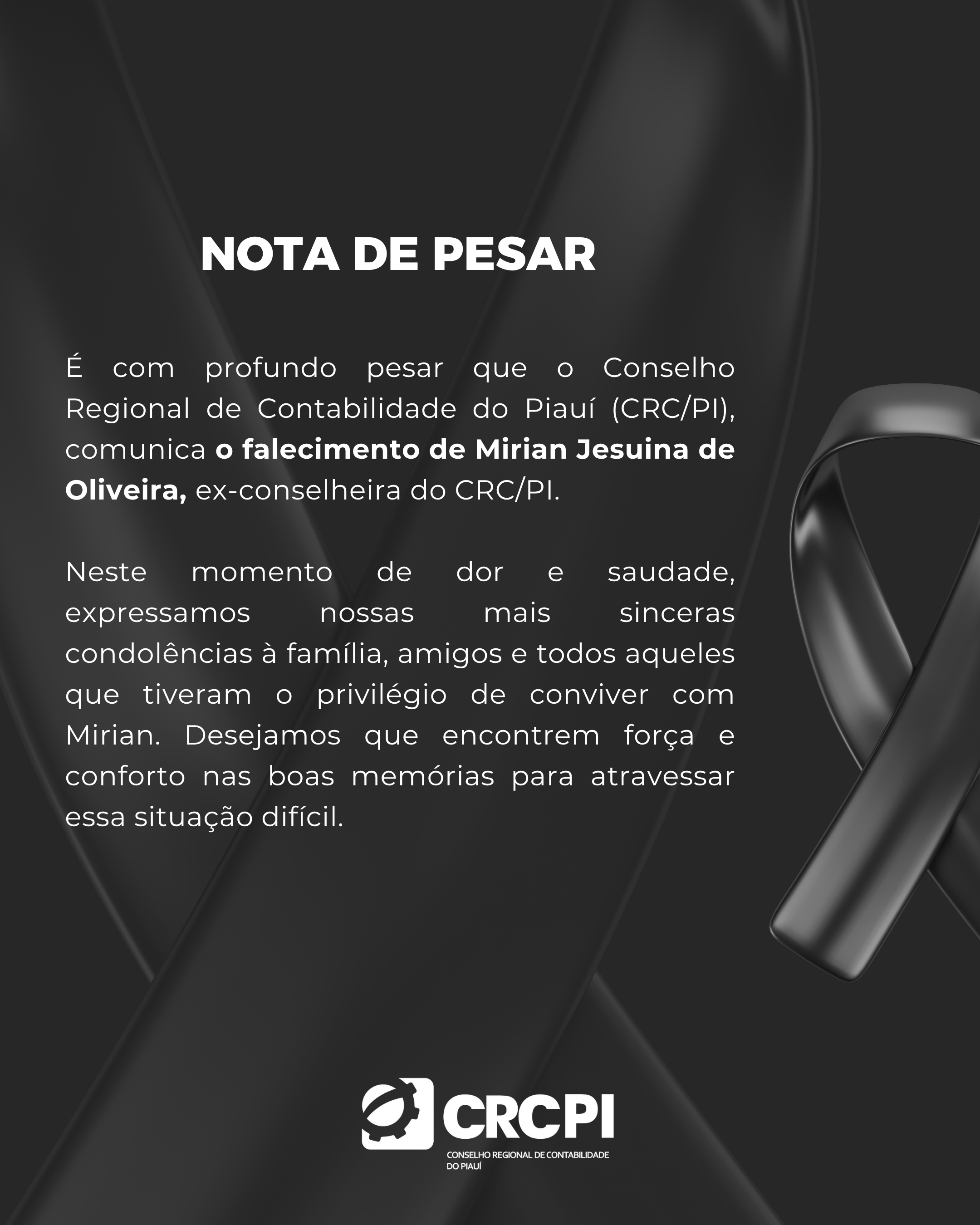 O CRC/PI lamenta imensamente o falecimento da ex-conselheira Mirian Jesuina de Oliveira. Agradecemos por toda a sua contribuição para a classe contábil piauiense e enviamos nossos sentimentos à família e amigos de Mirian.