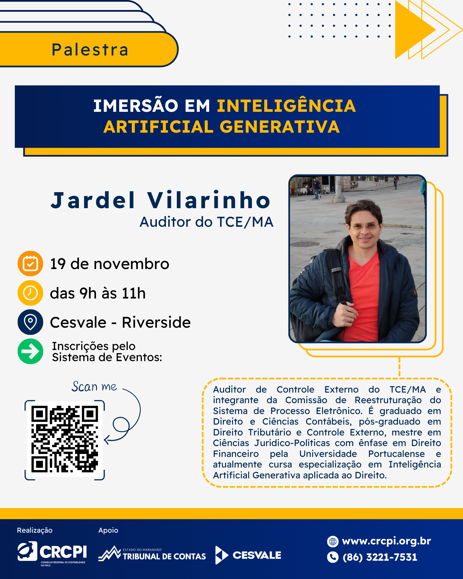 O curso “Imersão em Inteligência Artificial Generativa” será ministrado por Jardel Adriano Vilarinho da Silva, Auditor de Controle Externo do TCE/MA e especialista em Inteligência Artificial Generativa aplicada ao Direito.