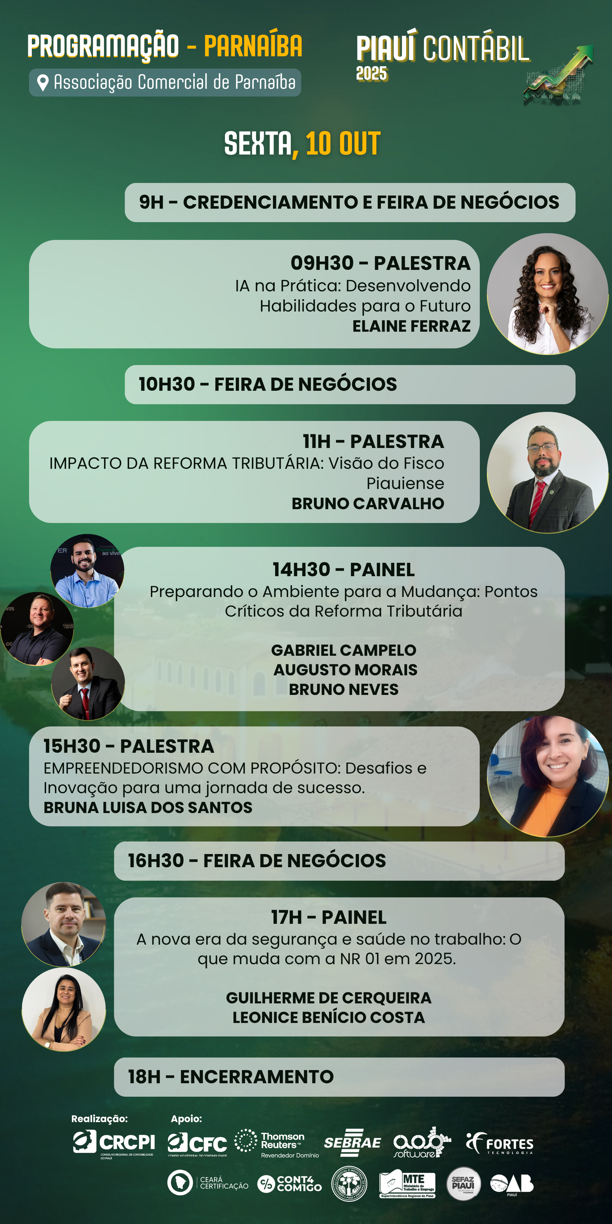 Às 17h, teremos o painel “A Nova Era da Segurança e Saúde no Trabalho: O que muda com a NR 01 em 2025”, com a participação de Guilherme de Cerqueira Madeira Campos (Auditor Fiscal do MTE) e Leonice Benício Costa (vice-presidente de Administração e Finanças do CRC/PI).